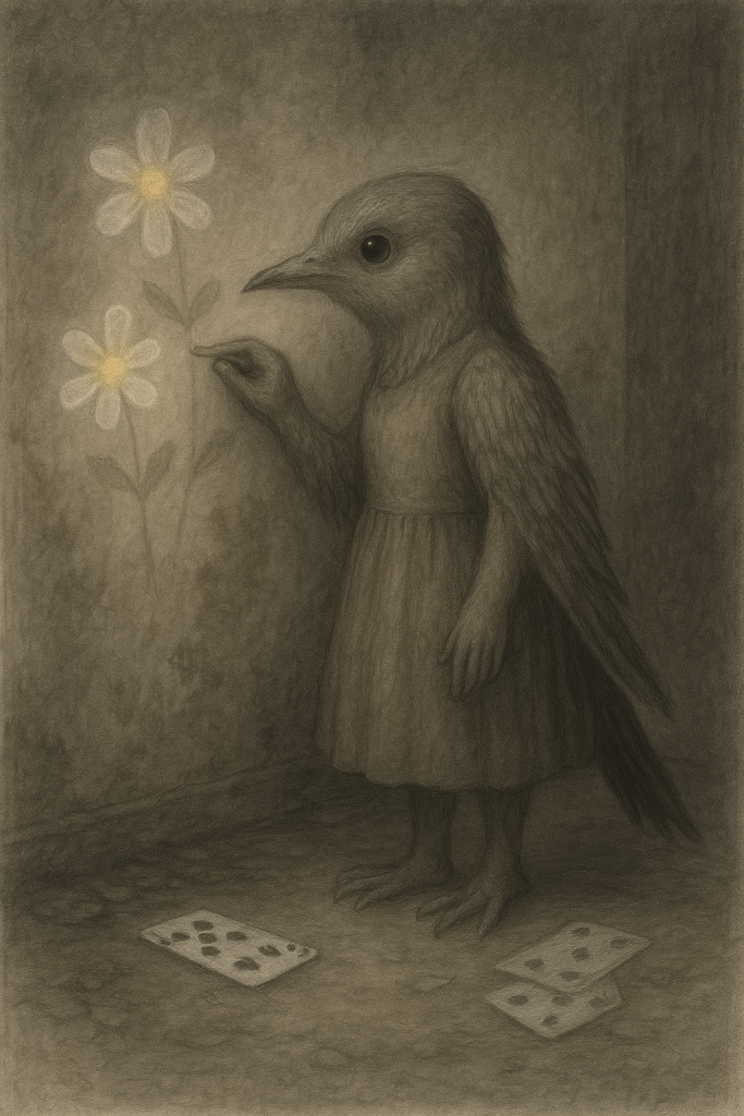 Jag räknar åtta nya blommor på tapeten. Lägenheten är mörk. Inga lampor funkar, kylskåpet luktar surt. Frysen gråter, jag ser tårar under trots att jag lagt dit tre ruter.