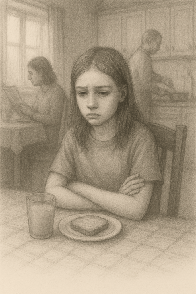 Så hon säger inget. Tar en skiva bröd. Inget pålägg. Tuggar långsamt, fast hon vill svälja snabbt och gå därifrån.